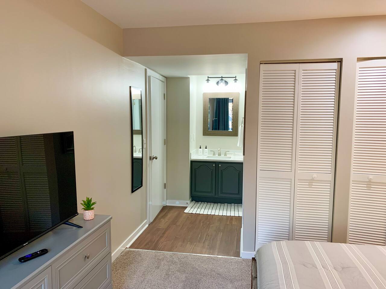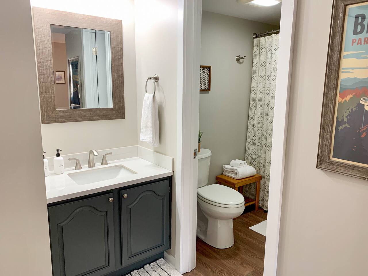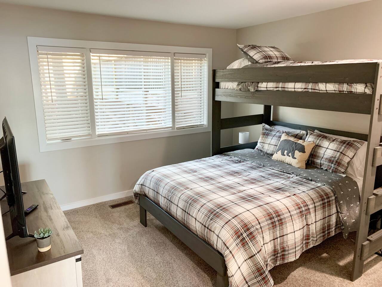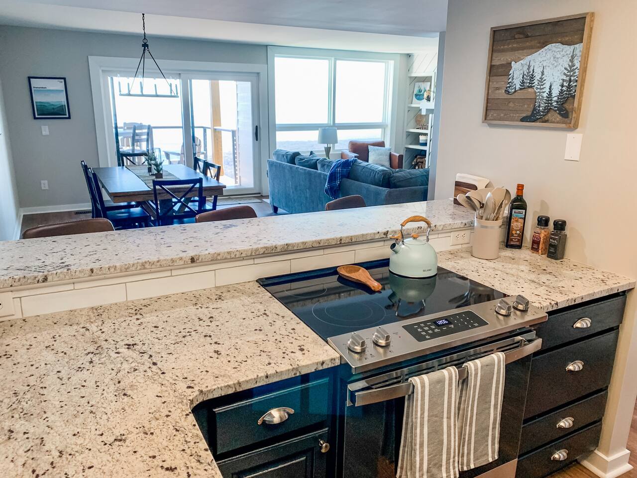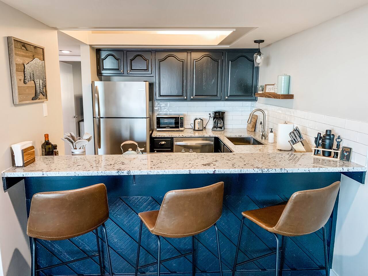 Welcome to our mountain top home, just minutes from the heart of the resort, connected to walking trails, and with spectacular views! Our home is ideal for families, couples, friends getaways, and folks exploring the brew and wine scene, and hiking and skiing. From the parking area you will take the outdoor walkway into the building and find our front door on the right. To the left of the front door a convenient bench and coat holder allows for easy removal of hiking and ski/snowboard boots along with hanging any outer wear or gear. As you enter our condo you will experience the warmth and personal touches that went into this new renovation. To your left you will find a modern designer dining table with seating for 6+. The table also provides the perfect workspace for anyone needing to get some things done. Our high speed Wi-Fi combined with the mountain views allow for a pleasant work experience. Beyond the table the space opens to the living room which features a large wood burning fireplace with endless firewood available in the wood racks out front. Above the fireplace hangs a 50" 4K Roku TV. Bring your own login and enjoy any apps! A small outdoors themed reading collection on the shelves, specially curated by us, also provides an excellent way to unwind. You will find the living room well appointed with comfy high end furniture including a sectional sofa and leather arm chair. Enjoy your morning coffee while watching the incredible sunrise over the mountains from our large windows! In the evening, after a long day of outdoor adventure you can unwind with a warm fire and enjoy time with loved ones while watching the sky fade from afternoon blue to starry black. Off of the living room the balcony provides a large space to enjoy the views and the fresh air. On the balcony we provide high quality furniture from Poly Wood, including a four seater high top table and two Adirondack style chairs. Coffee, meals, and evening beverages take on an even greater delight in this setting! To the right, just inside the front door, you will find a bar top that opens to the kitchen. The three leather bar stools offer a perfect space for guests to gather and socialize while someone prepares a meal. The kitchen features: ✤ Fully stocked cookware and dinnerware ✤ 12 pot coffee maker with coffee/creamer/sugar provided ✤ Olive oil/salt/pepper/soap/paper goods provided ✤ New stainless steel appliances ✤ New granite countertops Down the hallway you will find a coat closet, pantry, and a full bathroom. The bathroom was very recently fully renovated. Both of our bathrooms feature: ✤ Eco & health friendly products from Public Goods including shampoo, conditioner, body wash, hand soap, and lotion. ✤ High quality large bath towels and wash clothes from Standard Textiles. ✤ Makeup wash clothes from Standard Textiles. ✤ Hair dryers provided for each bathroom. The first bedroom off the hallway is the master with an ensuite full bathroom. This room has a king bed with a high quality Helix Hospitality Mattress. A dresser and 4K Roku TV are provided. There is also a double closet and blackout curtains. This bedroom contains a newly renovated en suite bathroom for added privacy. The end of the hallway leads to the 2nd bedroom. This room features a queen bed with Helix Hospitality mattress and a twin bunk bed. Between the two different bed options, adults and kids alike will enjoy sleeping here! A 4K Roku TV is also provided. A double closet provides ample room for hanging clothes and keeping suitcases out of the way. We provide a pack-n-play with sheets for anyone bringing a baby or young toddler! ATTENTION TO DETAIL ✔ We provide high end and health conscious Public Goods brand shampoo, conditioner, body wash, hand soap, and lotion. ✔ Our home has a washer and dryer along with ironing board and iron for your use. Detergent and dryer sheets are provided. ✔ We keep a first aid kit in the kitchen for minor cuts and scrapes. ✔ The living room, master bedroom, and second bedroom feature Roku TVs, just bring your own login and enjoy any standard app. ✔ We provide premium linens for each guest. ✔ We provide basic paper goods and consumables - paper towels, tissues, toilet paper, dishwasher tablets, dish soap, sponges. ✔ Coffee, creamer, sugar are included. ✔ If ANYTHING is amiss let us know and we will rectify the situation promptly!