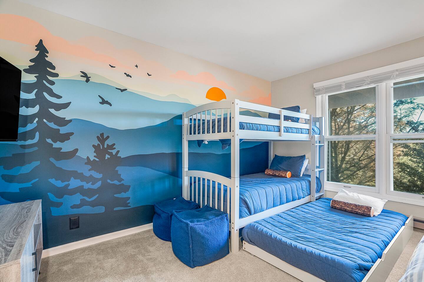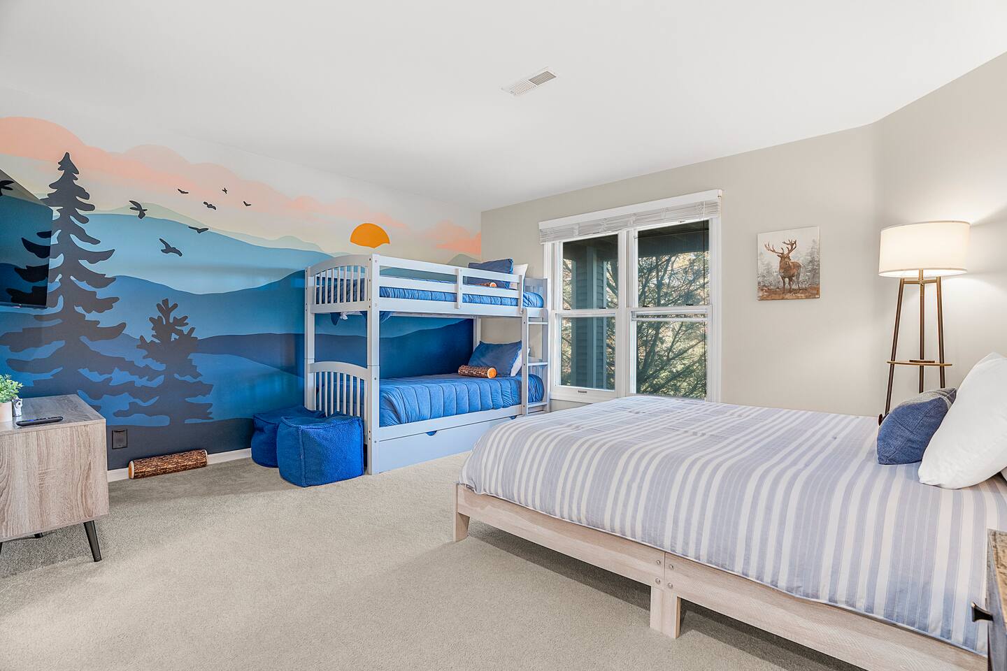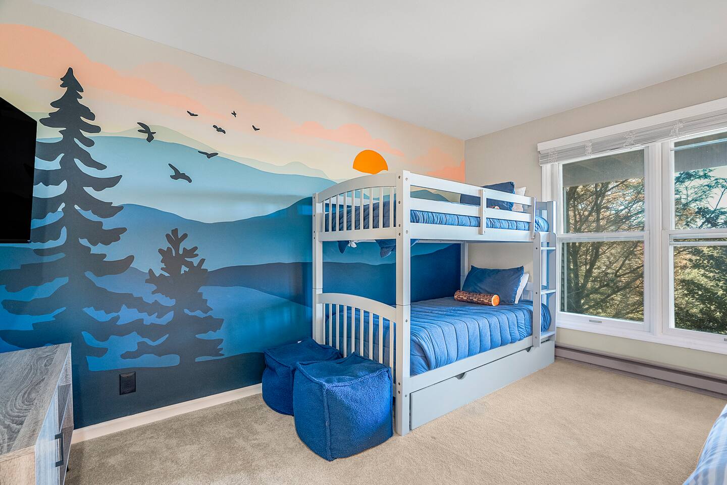 Welcome to our mountain top home, just minutes from the heart of the resort, connected to walking trails, and with spectacular views. Our home is ideal for families, getaways, exploring the brew and wine scene, and hiking and skiing. A short wooden walkway takes you from the parking spots to the front door. Immediately to your right you will see the lockable ski locker and complimentary stacked fire wood. When you come in the front door you will immediately experience the updated coziness and attention to detail in this home. MAIN LEVEL The Main Level features an open floor plan kitchen, dining, living space, and a half bath. The dining has seating for 8+ with additional bar seating for 5. The kitchen is well-equipped with updated finishes and all of the cookware and appliances you could need for a home-cooked meal. All of the basic necessities are provided - coffee, creamer, sugar, olive oil, salt & pepper. The living room boasts vaulted ceilings, wall-to-wall mountain views, a wood-burning fireplace (please bring your own firewood - easily obtainable locally!), and quick access to the scenic deck. On the deck we provide seating to allow you to enjoy a morning coffee or an evening glass of wine while watching the sunset. The Roku TV above the fireplace has just about every streaming app - bring your own app logins and enjoy all your regular shows. Guest mode ensures you will be automatically logged out at the end of your stay. We provide a custom made detailed Guide Book for your stay. Inside of it you will find abundant information about the house, local activities, hiking options, and the food, wine, and beer scene. BEDROOMS There are 4 bedrooms, each with their own updated private full-bath. ❆Bedroom 1 (top floor) features a queen bed and 3/4 bathroom. ❆Master Bedroom (middle floor) features a king bed, full bathroom with double vanity, walk in closet, and private deck with mountain views. ❆Bedroom 3 (middle floor) features a queen bed and private bathroom ❆Bedroom 4 (bottom floor) features a queen bed, twin bunkbeds, and private bathroom. ❆All 4 en-suite bathrooms have a hair dryer. ❆A pack-n-play with sheets is available for use. OUTDOOR SPACE A short 100 yard walk right up the hill from the home is a private community picnic area with gorgeous views of the mountains and valley. Enjoy an unforgettable mountain sunset as you relax and play bocci ball and corn hole. You will also have access to the outdoor Chestnut Springs and Rhodes Farms pools located nearby (Memorial Day through Labor Day) TRIP GUIDEBOOK We created a custom 34 page Trip Guidebook for our home that we will email to you a couple of days prior to check-in. A hard copy is also available in the home for use during your stay. Features include: ✔ Information about the house for check-in/out and during your stay ✔ Details about Wintergreen ✔ Information about area food, breweries, wineries, cideries, and distilleries ✔ Ideas for things to do with kids ✔ Ideas for activities and day trips ✔ Our favorite hiking trails both in and around Wintergreen ATTENTION TO DETAIL ✔ We provide high end and health conscious Public Goods brand shampoo, conditioner, body wash, hand soap, and lotion. ✔ Our home has a washer and dryer along with ironing board and iron for your use. Dryer sheets and detergent are available. ✔ We keep a first aid kit in the kitchen for minor cuts and scrapes. ✔ The living room, master bedroom, and downstairs kid friendly bedroom feature Roku TVs, just bring your own login and enjoy any standard app. ✔ We provide premium linens for each guest. ✔ We provide basic paper goods and consumables - paper towels, tissues, toilet paper, dishwasher tablets, dish soap, sponges. ✔ Coffee, creamer, sugar are included. ✔ If ANYTHING is amiss let us know and we will rectify the situation promptly!